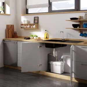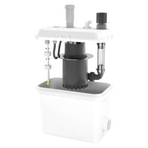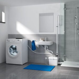 Bombagem de águas residuais domésticas de máquinas de lavar, chuveiros, lavatórios, etc. Instalação apoiada à superfície em zonas abaixo do nível de retorno.